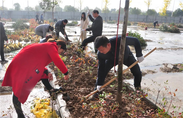 上午8:30,桂花城奧特萊斯購物廣場上,大家三五成組、相互協作,扶直苗木、揮鍬填土、壓平踏實……活動現場,參加植樹的萬家園集團本部員工干勁十足、熱情高漲。