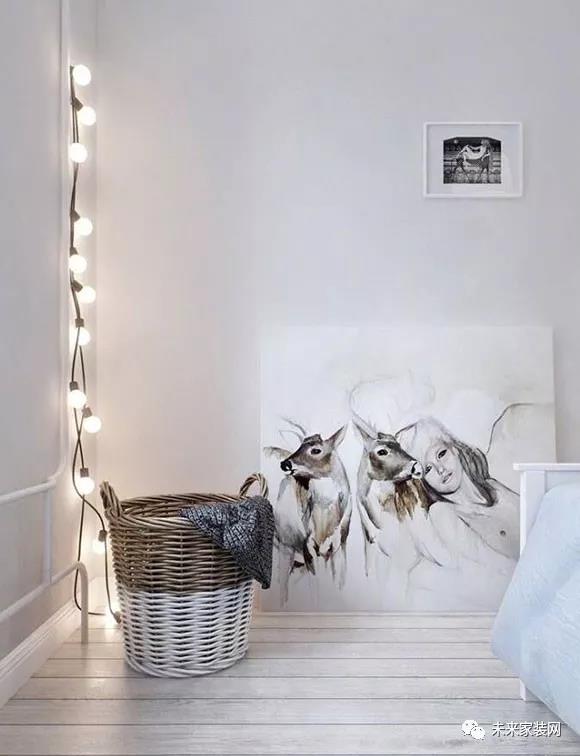 床尾墻面拐角處的燈帶和收納筐,隨意的擺放方式顯得更加自然,不必去刻意的追求設計效果,隨意而為或許才是幸福的家居生活。