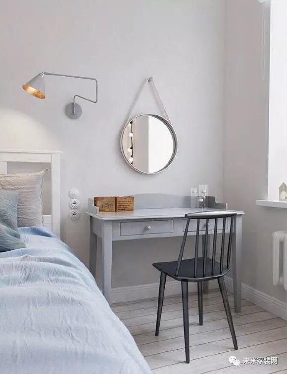 淺灰色的梳妝臺,搭配漂亮的黑色椅子,墻面再掛上圓形的化妝鏡,靜謐的家居時光讓人可以忘記所有的憂愁與煩惱。