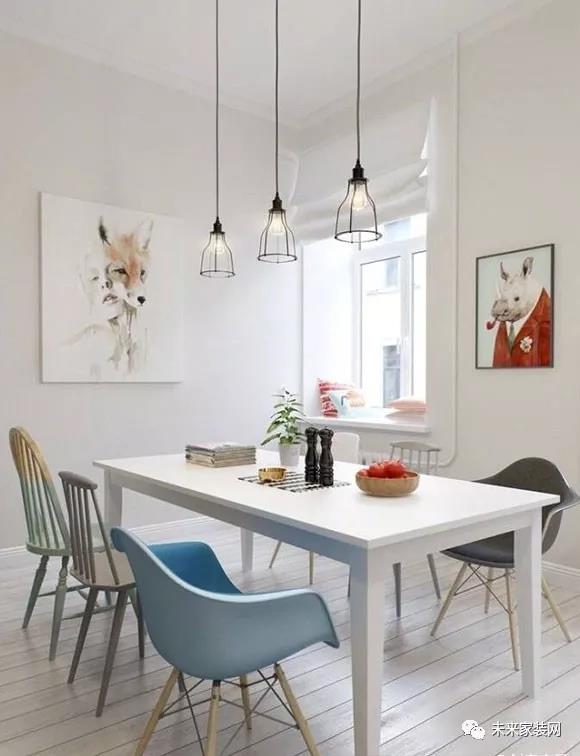獨立的餐廳空間,長方形的白色餐桌,配上幾把造型、色彩不同的餐椅,有點復古的設計感讓人感覺熟悉而親切,越簡單的裝修反而更有品位。造型優雅的小吊燈,畫面很個性的裝飾畫,恰到好處的軟裝搭配營造出溫馨愜意的家居氛圍。